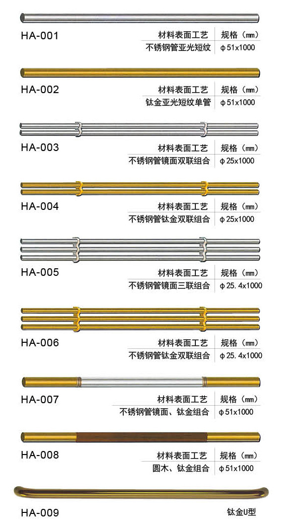 本公司根據(jù)不同轎廂裝潢之特點,設計了不銹鋼圓管、橢圓管、方管、鈦金管、木質、不銹鋼發(fā)紋板、有機柱等不同材質、不同式樣的扶手十余款,造型優(yōu)美、尺寸齊全,用戶在購買轎廂裝潢時可根據(jù)個人喜好自由選配。