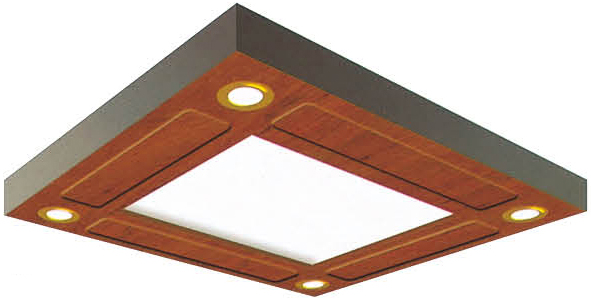 中間是白色透光板,四周以木質(zhì)造型工藝板加筒燈